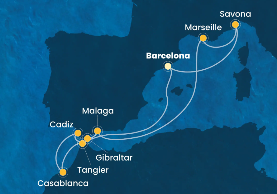 Barcelona, Cadiz, Tanger, Casablanca, Gibraltar, Malaga, Marsilia, Savona, Barcelona