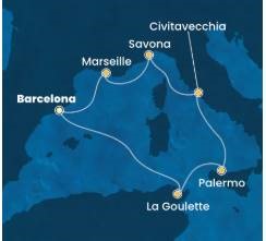 Barcelona, Palma de Mallorca, Palermo, Civitavecchia, Savona, Marsilia, Civitavecchia
