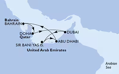 Dubai, Sir Bani Yas, Abu Dhabi, Bahrain, Doha, Dubai