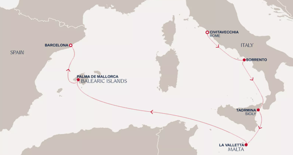 Civitavecchia, Sorrento, Giardini Naxos, La Valletta, Palma de Mallorca, Barcelona