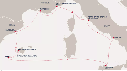 Barcelona, Marsilia, Nisa, Argentario, Napoli, Palermo, Ibiza, Palma de Mallorca, Barcelona