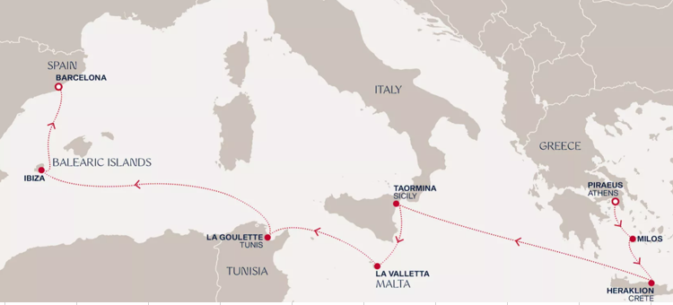 Pireu, Milos, Heraklion, Giardini Naxos, La Valletta, La Goulette, Ibiza, Barcelona