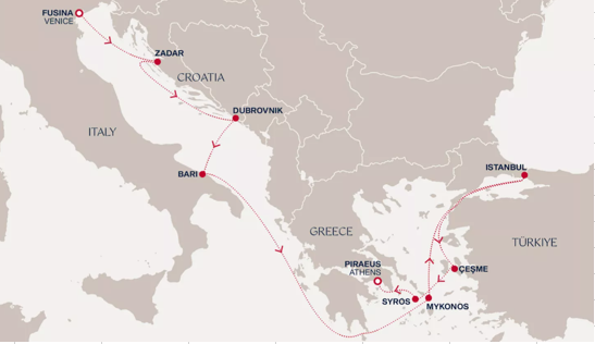 Venetia, Zadar, Dubrovnik, Bari, Mykonos, Istanbul, Cesme, Syros, Pireu