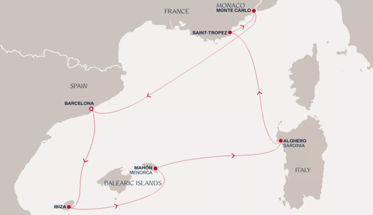 Barcelona, Cadiz, Tanger, Motril, Cartagena, Saint-Tropez, Monte Carlo, Livorno, Civitavecchia