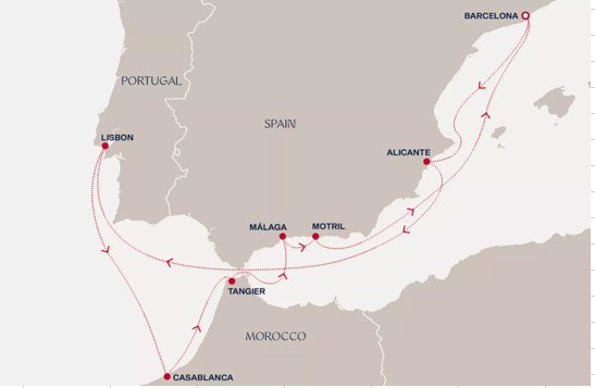 Barcelona, Alicante, Lisabona, Casablanca, Tanger, Malaga, Motril, Barcelona