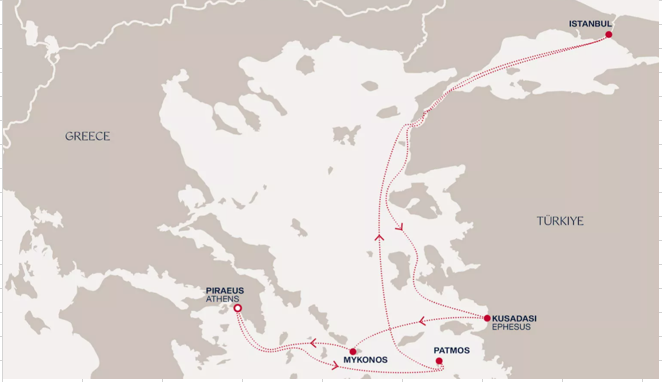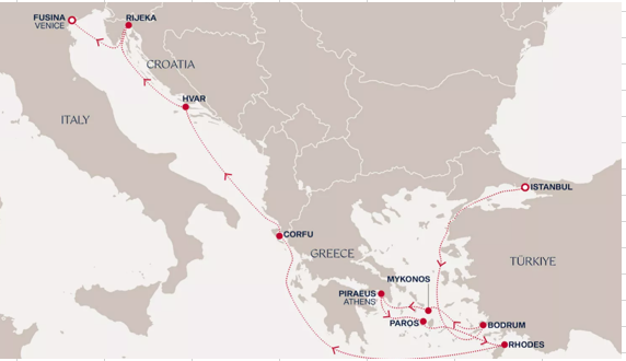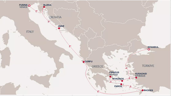 Istanbul, Kusadasi, Patmos, Pireu, Paros, Rhodos, Corfu, Hvar, Rijeka, Venetia