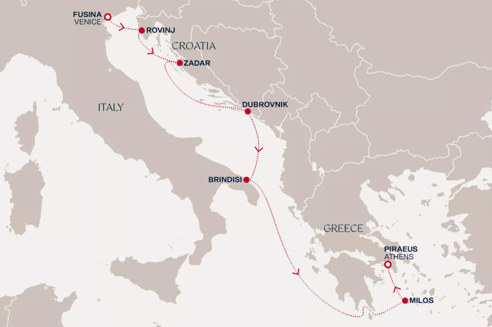 Venetia, Rovinj, Zadar, Dubrovnik, Brindisi, Milos, Pireu