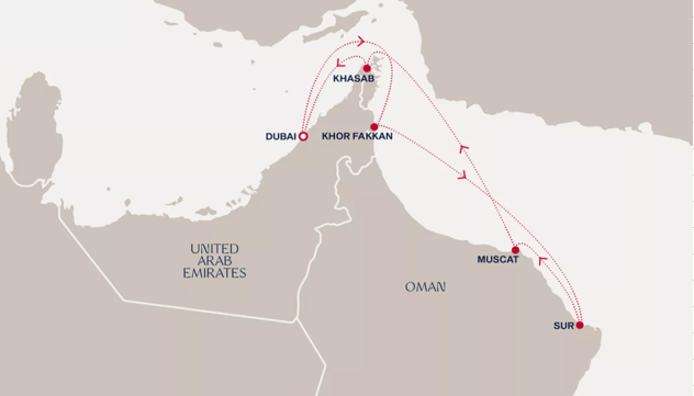 Dubai, Khor Fakkan, Sur, Muscat, Khsab, Dubai