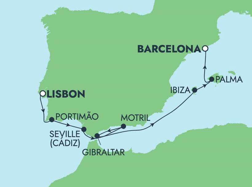 Lisabona, Portimao, Cadiz, Mortil, Gibraltar, Ibiza, Palma de Mallorca, Barcelona