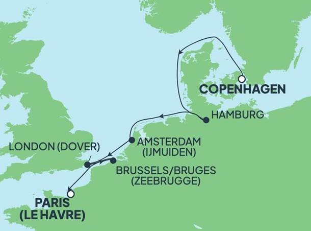 Hamburg, Zeebrugge, Le Havre, Southampton, Cherbourg, Hamburg