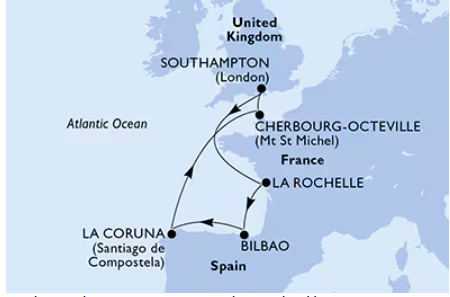 Barcelona, Cadiz, Tanger, Casablanca, Gibraltar, Malaga, Marsilia, Savona, Barcelona
