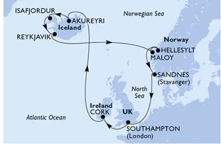Hamburg, Haugesund, Maloy, Hellesylt/ Geiranger, Molde, Nordfjordeid, Flam, Alesund, Hamburg