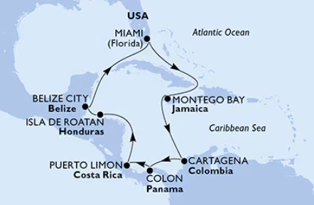 Miami, Montego Bay, Cartagena, Colon, Puerto Limon, Roatan, Belize City, Miami
