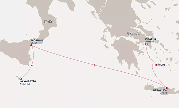 Pireu, La Valletta, Catania, Taranto, Kefalonia, Mykonos, Pireu