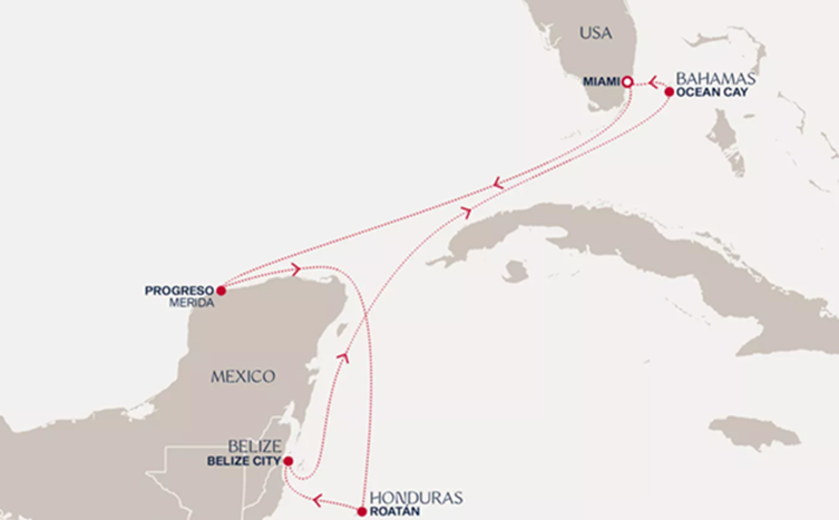 Miami, Isla de Roatan, Costa Maya, Cozumel, Bahamas, Miami, Puerto Plata, San Juan, Bahamas, Mi...
